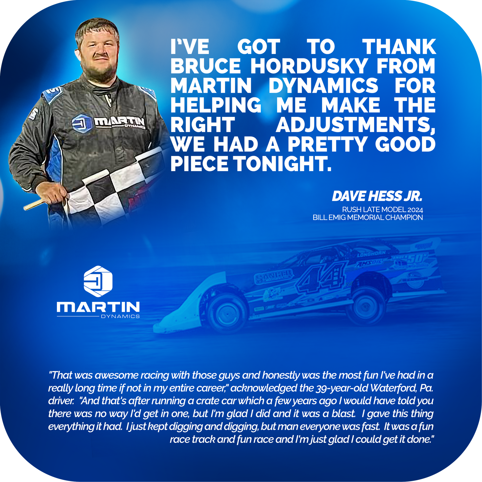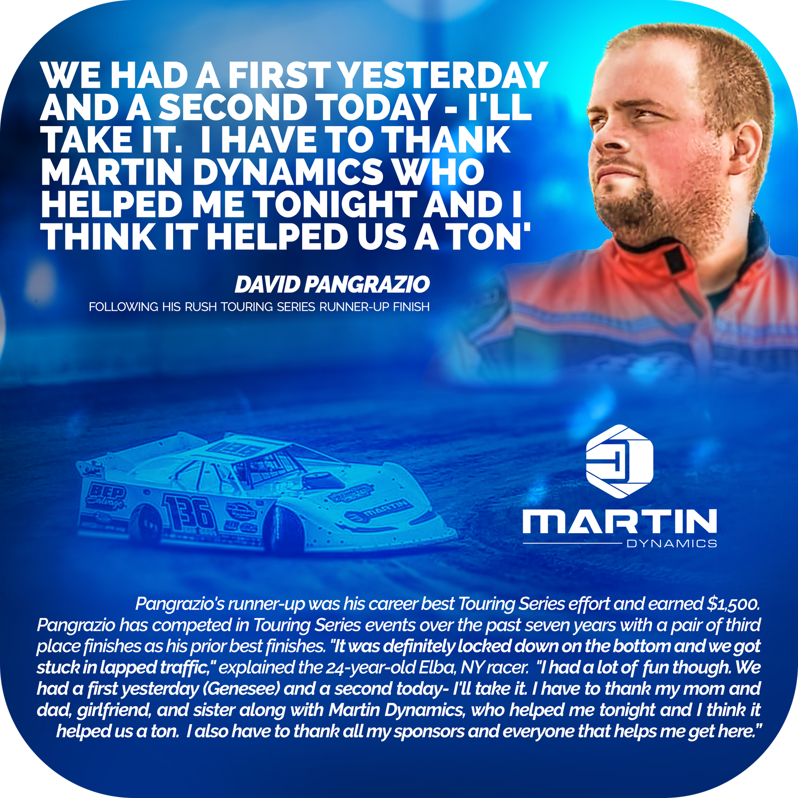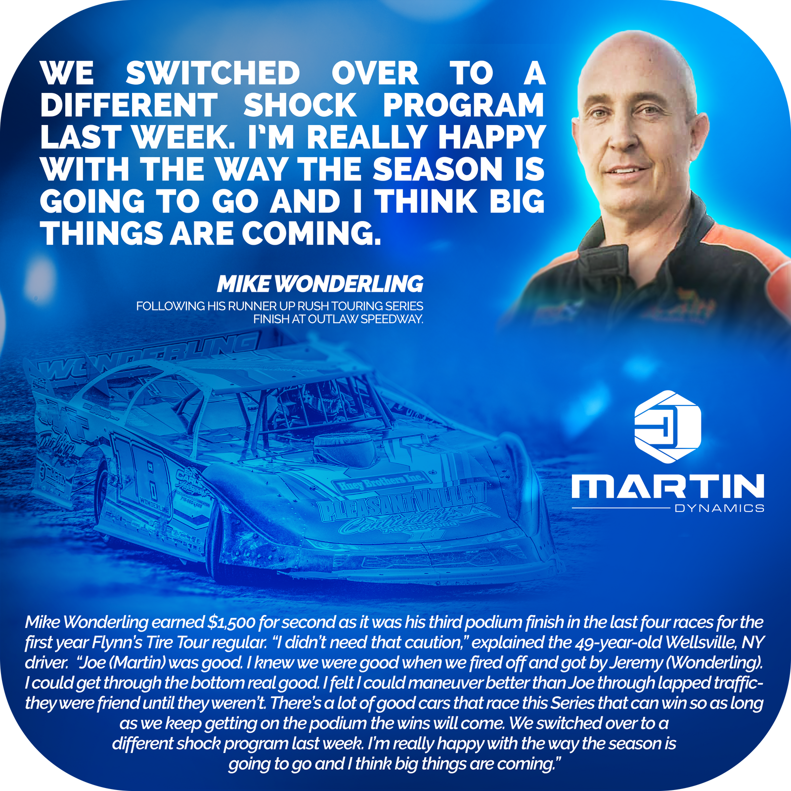 The first thing that we do with all of our customers is spend 60 minutes 1 on 1 with them to learn about their program, their chassis, their setup preferences, and their driving style.